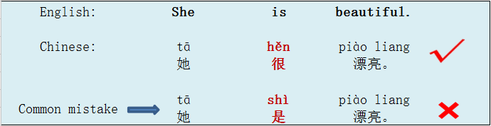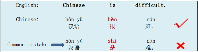 | Many learners are puzzled why we don't translate "to be" as 是(shì) here, instead we put another word 很 (hěn) between the subject and the adjective, which means very in English. Although 很 (hěn) means very, here we do not imply its literal meaning of very in this context. So the word 很 (hěn) is not used to emphazise "very" , just a linking word to connect the subject and the adjective. |